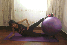一手手臂撐地,另一手臂叉腰,雙腿夾住瑜伽球,上下移動腰部,注意身體保持直線,堅持5分鐘,再換邊,繼續5分鐘。