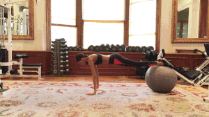 雙手撐住地面,雙腳放在瑜伽球上面,來回滾動瑜伽球,注意翹臀,堅持五分鐘。