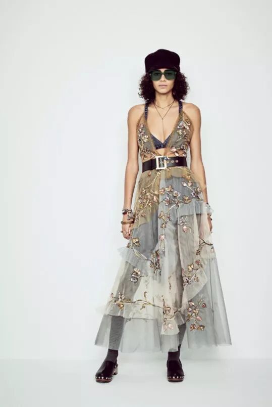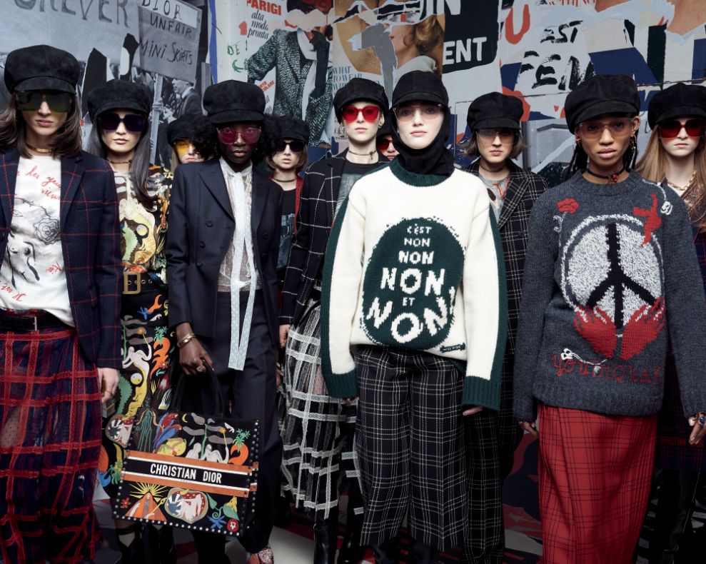 「Dior時裝屋在那個特定歷史時代中,所開創的嶄新姿態,令我深受啟發,」創意總監Maria Grazia Chiuri這樣表示道。今年五月標誌著1968年法國學生運動的五十周年,彼時的創意總監Marc Bohan 亦是在這個主張創意自由的年代開創了時裝屋第一個成衣線——Miss Dior(迪奧小姐)系列,兩件在人文歷史中都頗具紀念意義的事件,讓Christian Dior充滿鼓舞力量的最新系列更具跨時代意義。Chiuri和Bohan的設計理學在某種程度上是存在諸多性的,他們對於自己身處的特定人文環境和自己所面向的客戶群有著極為精準的定位。如果說當年,一群年輕女性在品牌精品店前抗議的是為何店里沒有足夠的迷你裙,那麼在受Trump政治態度動蕩的當下,年輕女性渴望表達自我主張,宣揚獨立的精神需求,則被這位品牌歷史中首位女性掌門人體恤和關懷。