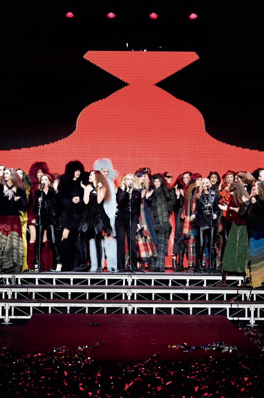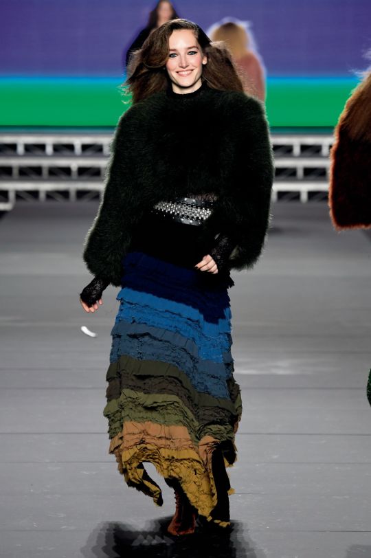 在樂隊演繹經典曲目《He was Really Sayin’ Something》之時,品牌最具辨識度的條紋針織圖案出現在舞台的大螢幕上。搭配鉚釘裝飾踝靴出現的長袖高領條紋針織裙和漸變色荷葉交叉肩帶長裙,均是令眾人都再熟悉不過的經典好設計。接近大秀結尾的多款亮片裝點設計,也無不將這位傳奇時裝偶像對女性、生活和獨立精神的歌頌大肆宣揚。秀場上冒泡的幸福感將新一代設計總監對自由主義的推崇,表述得清晰卻不激進,相信這點足以令Sonia Rykiel感到極其欣慰。