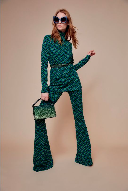 出於對創始人經典設計的致敬,品牌1970年代古董幾何立體方塊圖案的再度出現,無疑是一個令人不容忽視的亮點。無論是出現在針織套裝、系帶連身衣,還是短袖長裙之上,這些或大或小的印花都顯得極具紀念意義。該系列中一款以球衣面料打造的罩衫和闊腿褲造型,靈感是來源於DVF本人於1980年代首創的「運動服」,這款在當時社會被譽為「貴族專屬運動衣」的設計,在當季被注入了更為挺拔的廓型,背部挖空設計和袖口上的紐扣裝飾,都是極為摩登的造型考量。鸚鵡印花,這個曾多次出現的品牌系列中的設計元素,也在當季的作品中占有不小篇幅,出現在了天鵝絨套裝、長袖針織和多款裙裝之上。「Diane非常喜歡具有靈動感的印花,所以飛翔的鸚鵡圖案是我在該系列中,對典藏設計元素的再度演繹。」設計師如此表示。