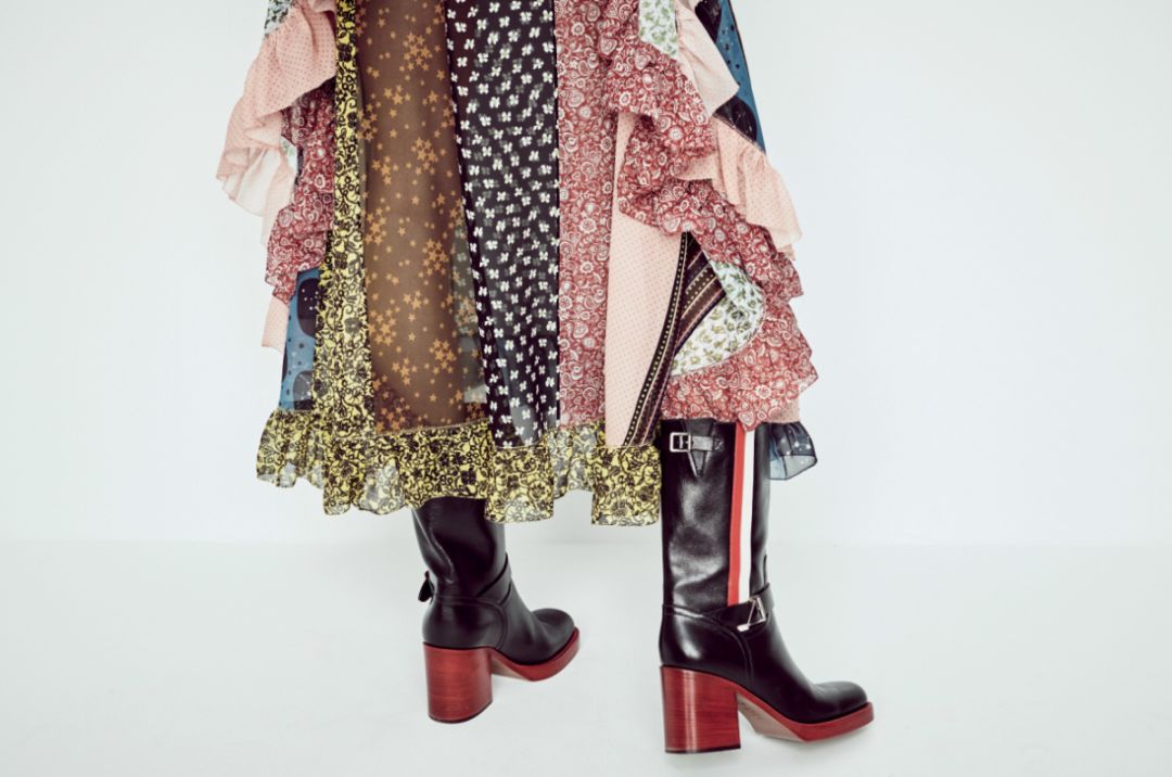 1960年代末盛行的鉤針編制設計、混織面料和手工刺繡印花,被以極具當代的設計口吻重新解讀,從archive面料中復刻的印花,更是在一派致敬經典的立意中顯得應時應景。桌巾式翻領裝飾白襯衫與皮革大衣的搭配,非常吻合Chiuri對摩登女性特質的一貫理解。學院風夾克與蘇格蘭短裙,在平底機車靴的中和下,讓復古情調凸顯得極為恰到好處,而秀場中一些以絲綢格紋面料重新演繹的裙裝款式,更是讓熟知Chiuri作品的看客們,感到極為親切,這些從她第一個系列就出現過的飄逸材質,在當季被演繹得更有力量。被抗議遊行新聞頭條標語填滿的秀場背景,無疑讓觀眾在大秀開始之前,就對當季的風格呈像有所洞察。靠攏年輕族群審美的訴求,在多款寬鬆的印花毛衫上有所體現。避開一切憤怒與激進的情緒,Chiuri的秋冬配色和造型構成亦是聰明並具有吸引力的,將當代女性日常生活需要作為不二核心,該系列的多款單品均可輕而易舉地從白晝過渡至黑夜。廓型略微放鬆的夾克上衣和裙裝、馬賽克效果的丹寧拼接襯衫裙和九分半裙,以及羊羔毛翻領鬥篷式大衣,都極為時髦。