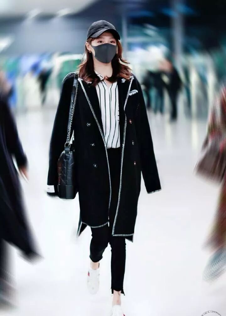 這次關曉彤穿了一件黑色的外套,看起來特別的大氣了,內搭了白色的條紋的襯衫看著很帥氣了,下半身穿的是黑色的緊身褲