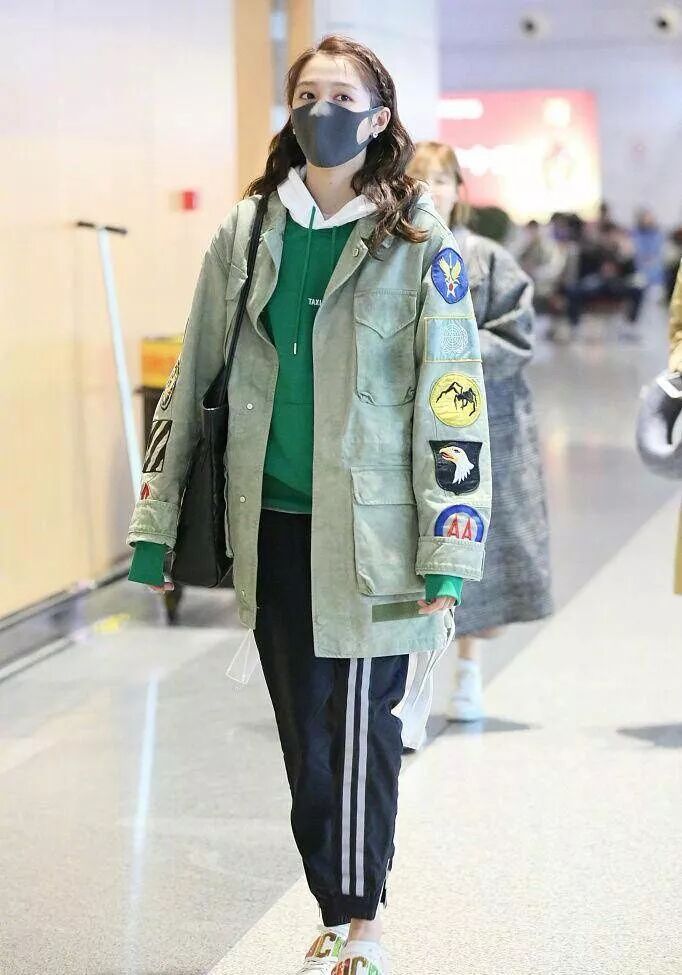 藍色的外套內搭的一件綠色的衛衣,感覺關曉彤還是比較喜歡那種混搭的風格,可能是因為穿起來比較的舒服所以無所畏懼。