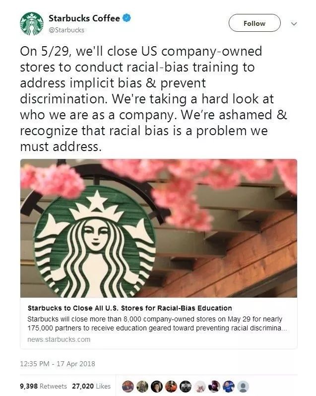 全美8000多家星巴克還是同時關門停業,旗下所有員工都要接受反歧視培訓。