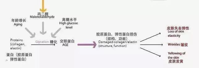 ▲由於身體各部位都存在蛋白質,所以糖化反應對身體的損害是全面性的。同時糖化反應產生的AGEs除了讓我們皮膚變得蠟黃外,還會導致真皮層彈性蛋白、膠原蛋白髮生交聯,使皮膚支撐力下降,失去彈性,總而言之就是皮膚老化!