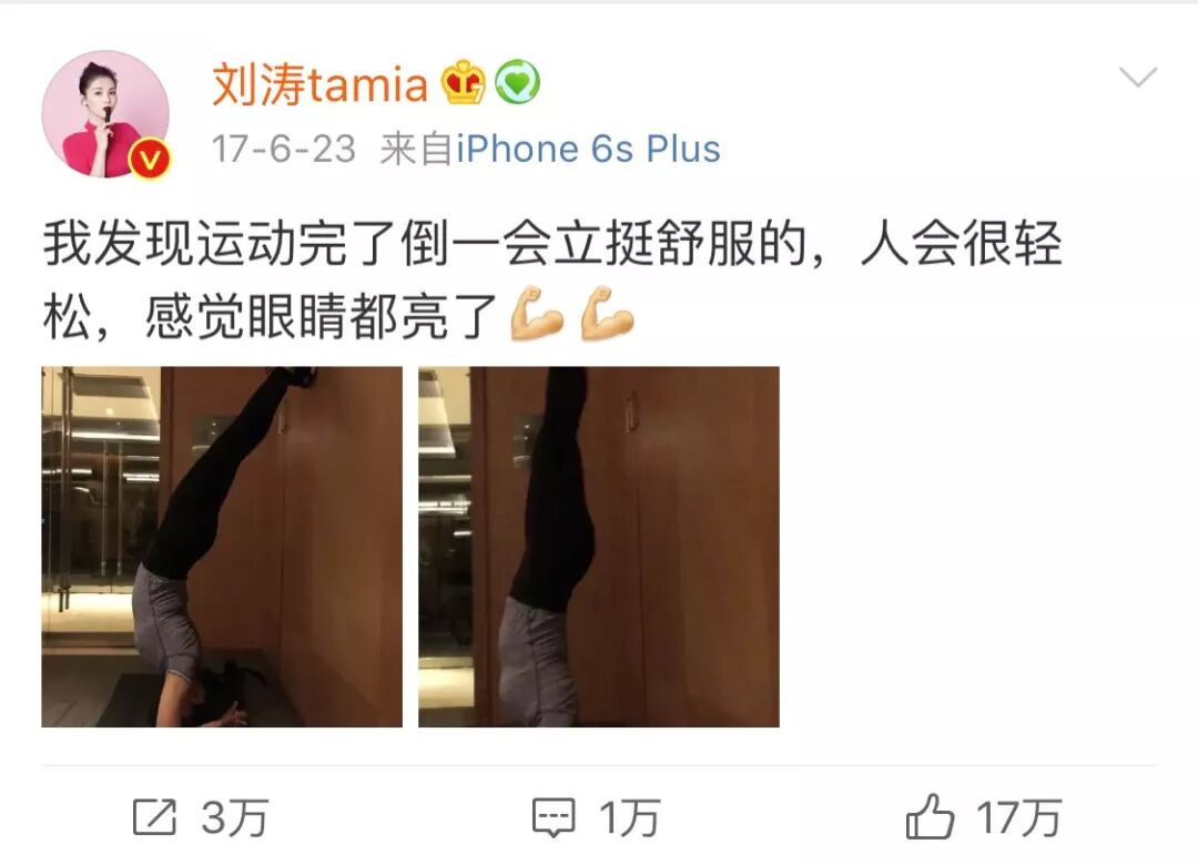 她曾在微博上說,「我發現運動完了倒一會立,挺舒服的,人會很輕鬆,感覺眼睛都亮了」。