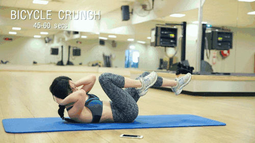 雙手抱於腦後,玩去雙膝,隨著膝蓋的前伸與頭部的轉動,做交替蹬腿,共做45到60秒,中間休息30秒,每次做4組。