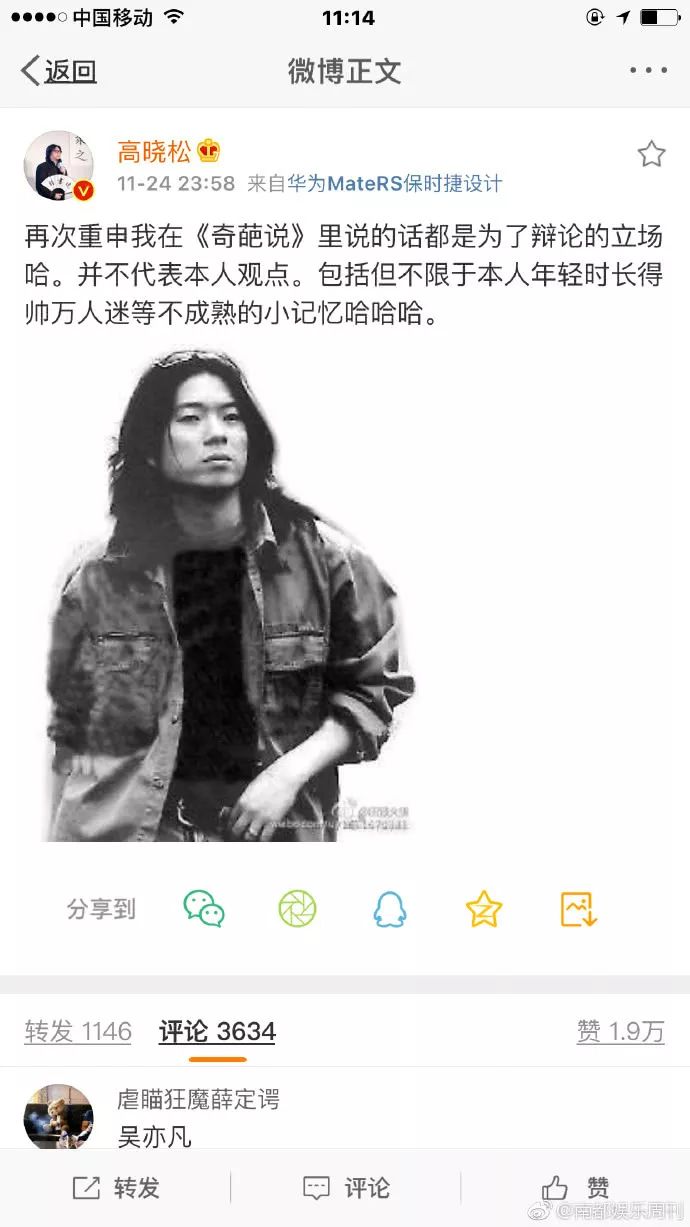 昨晚,高曉松回應「年輕時像吳亦凡」的言論,針對自己在某綜藝節目中表示「年輕時像吳亦凡」的言論,表示「再次重申我在節目里說的話都是為了辯論的立場哈。並不代表本人觀點。」高曉松還特地選出一張自己年輕時的帥照,分享自己自己「不成熟的小記憶」
