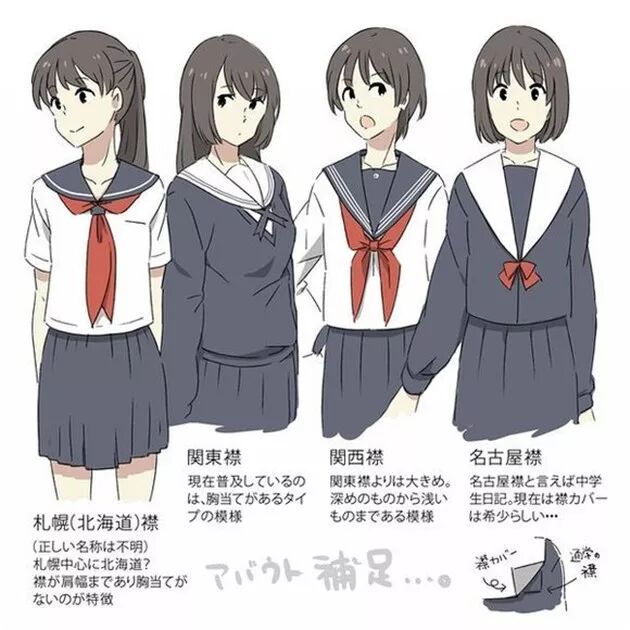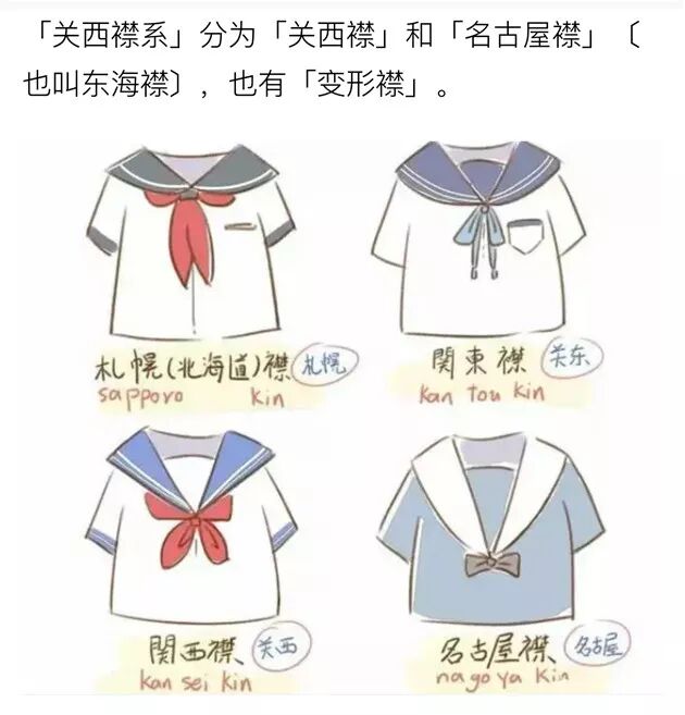 日本的水手服的衣襟通常是分為兩大系關東襟系和關西襟系,關東襟系分為關東襟和札幌襟(亦稱北海道襟),關西襟系分為關西襟和名古屋襟(亦稱東海襟)。