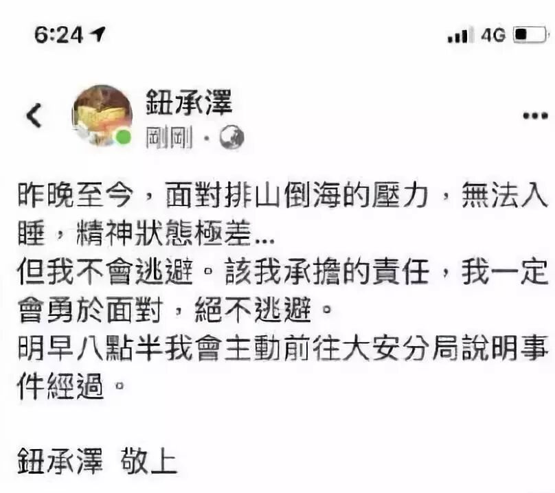 12月6日傍晚,鈕承澤終於在社交平台上發聲回應,表示自己將於7日早上八點半前往警局交待,並表示自己會為此事承擔責任。