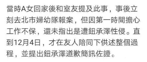 媒體此後聯絡到A某的友人,得知A某是鈕承澤新片《跑馬》劇組的一名成員。她加入劇組後,鈕承澤頻頻對其大獻殷勤,但當時她以為只是導演為了緩和劇組緊張的拍攝氣氛,不虞有他。誰知11月下旬的一天,鈕承澤突然以身體不適為由取消了劇組的會議,卻通知A某的主管帶著A某一起到他住處談話。抵達時,屋內還有不少人,但後來眾人陸續離開,僅留下鈕承澤、A某及其主管。