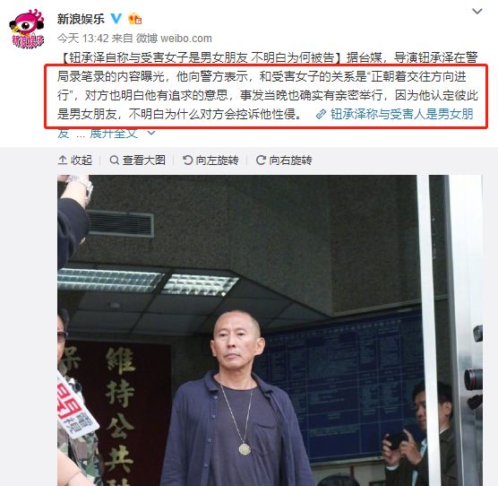 另一側,導演鈕承澤被指性侵其新片《跑馬》女演員小A。