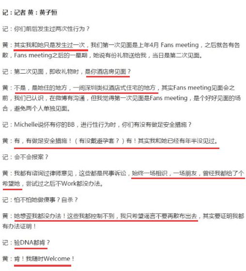 Michelle稱,見面會後一周,她跟黃子恒提到自己給他買的禮物無法寄到香港,黃子恒就提出正好他要去深圳辦事,可以去她住的酒店房間拿,然後兩人就發生了不可描述的故事。