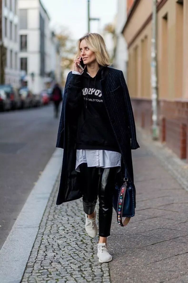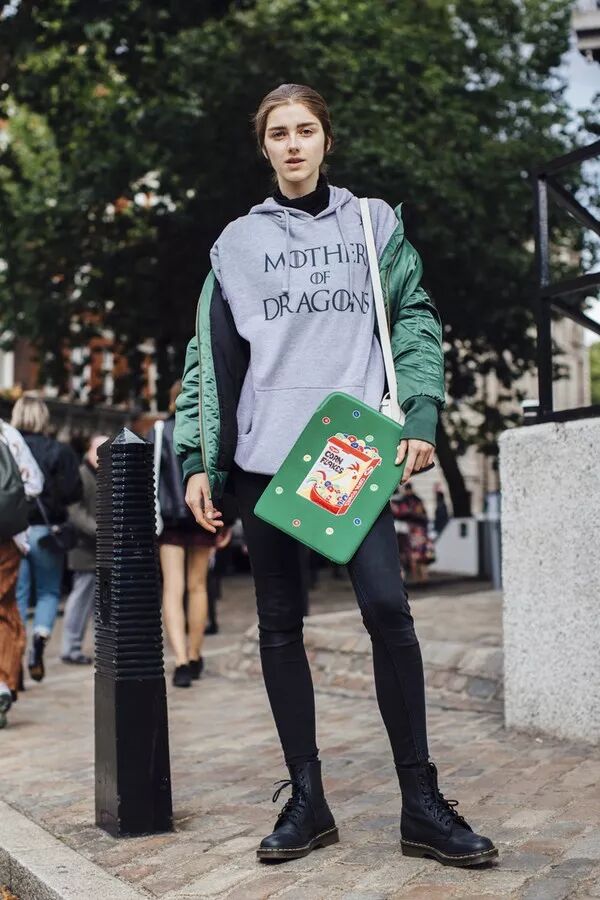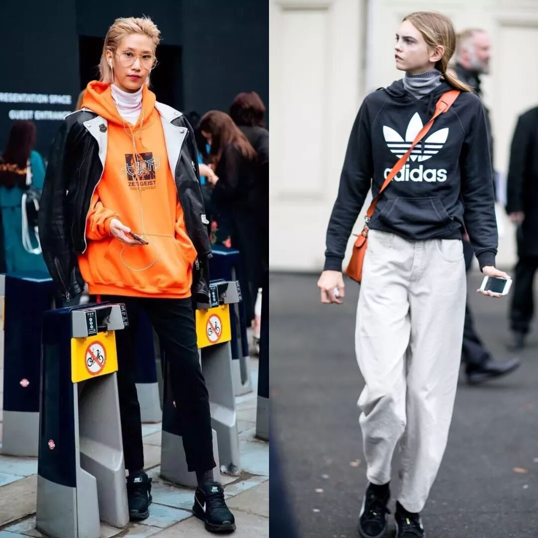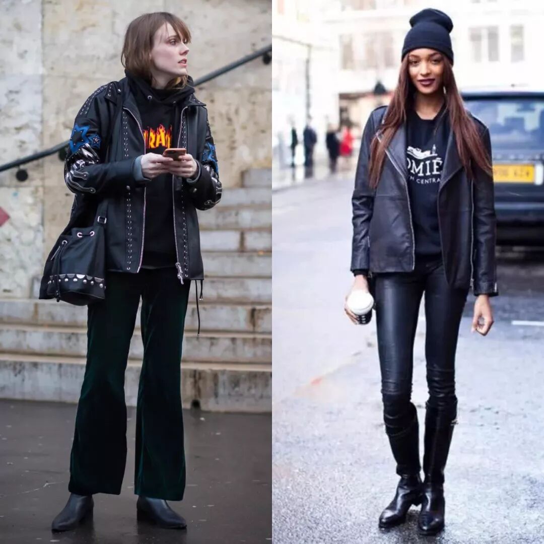 不過時髦精們往往更鐘意用帶有印花logo元素的黑色衛衣+皮夾克,這樣既強調了造型的整體感,同時還又非常吸睛出挑。