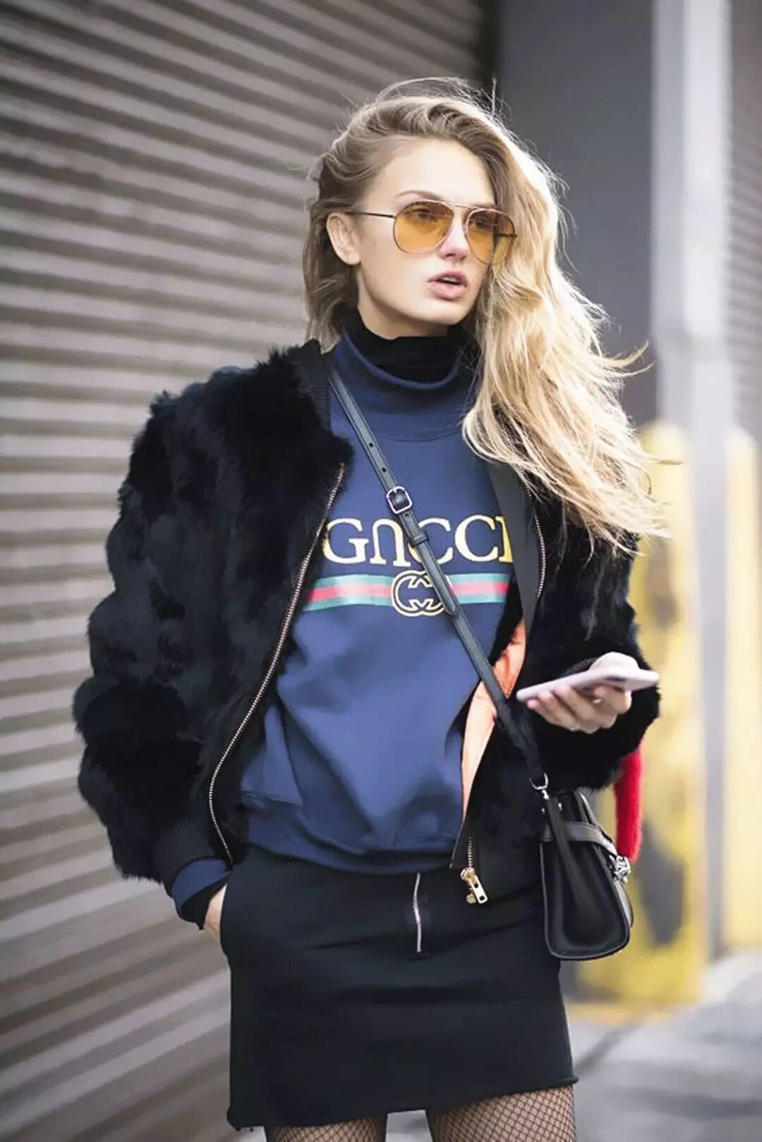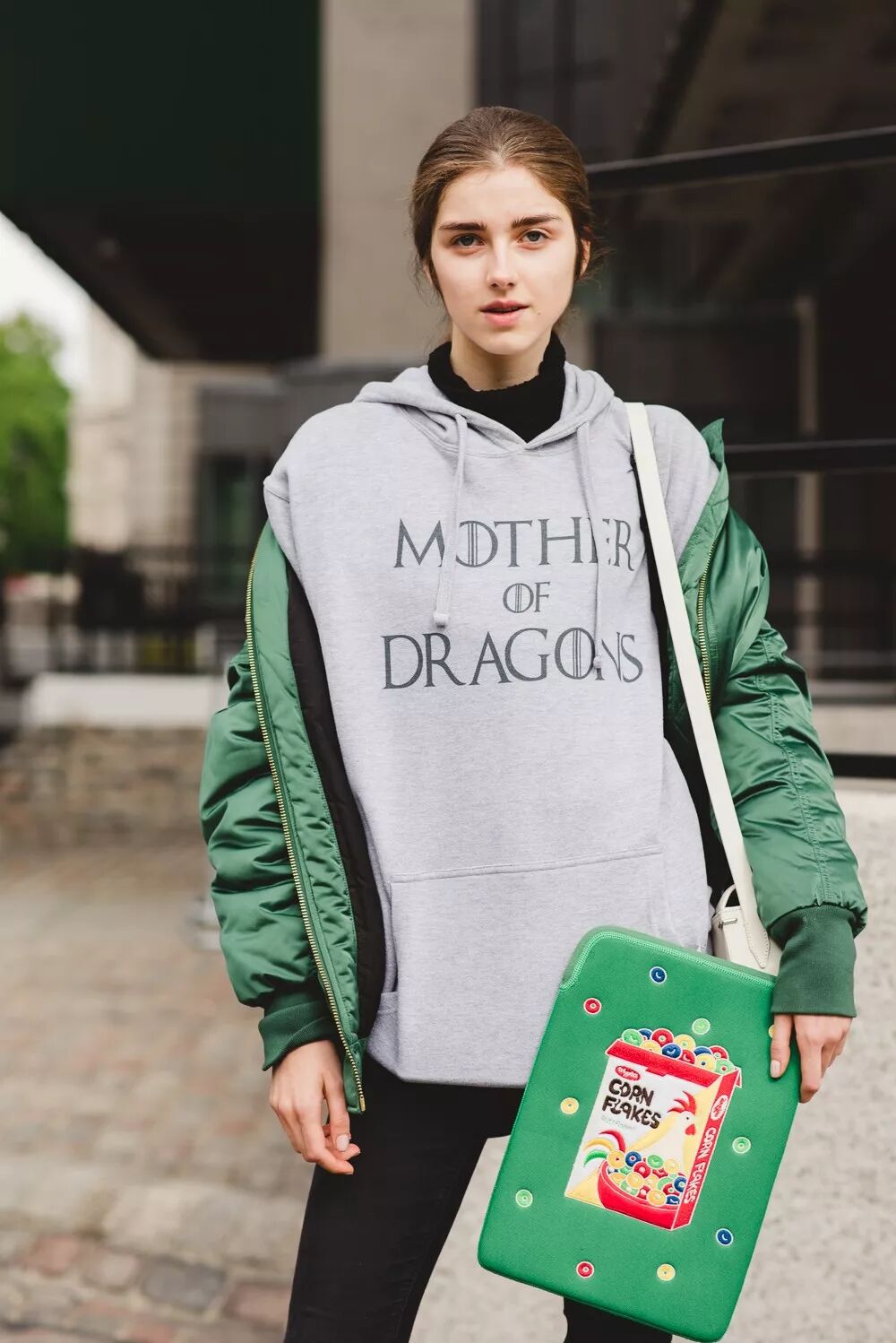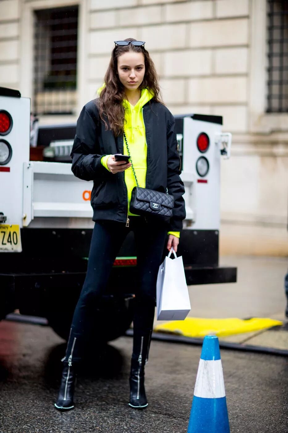 不過時髦精們往往更鐘意用帶有印花logo元素的黑色衛衣+皮夾克,這樣既強調了造型的整體感,同時還又非常吸睛出挑。