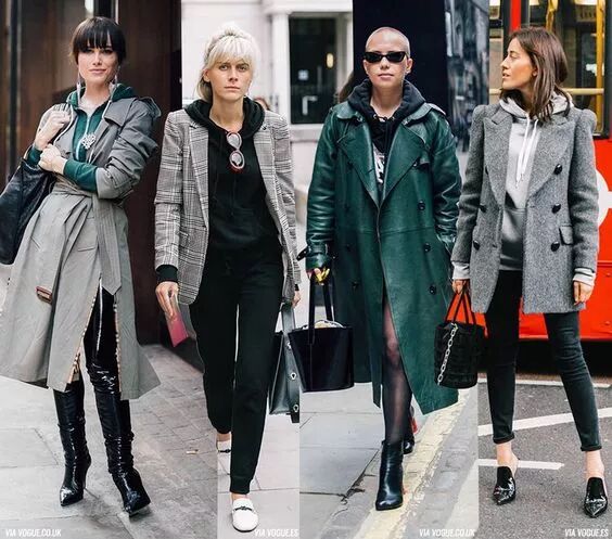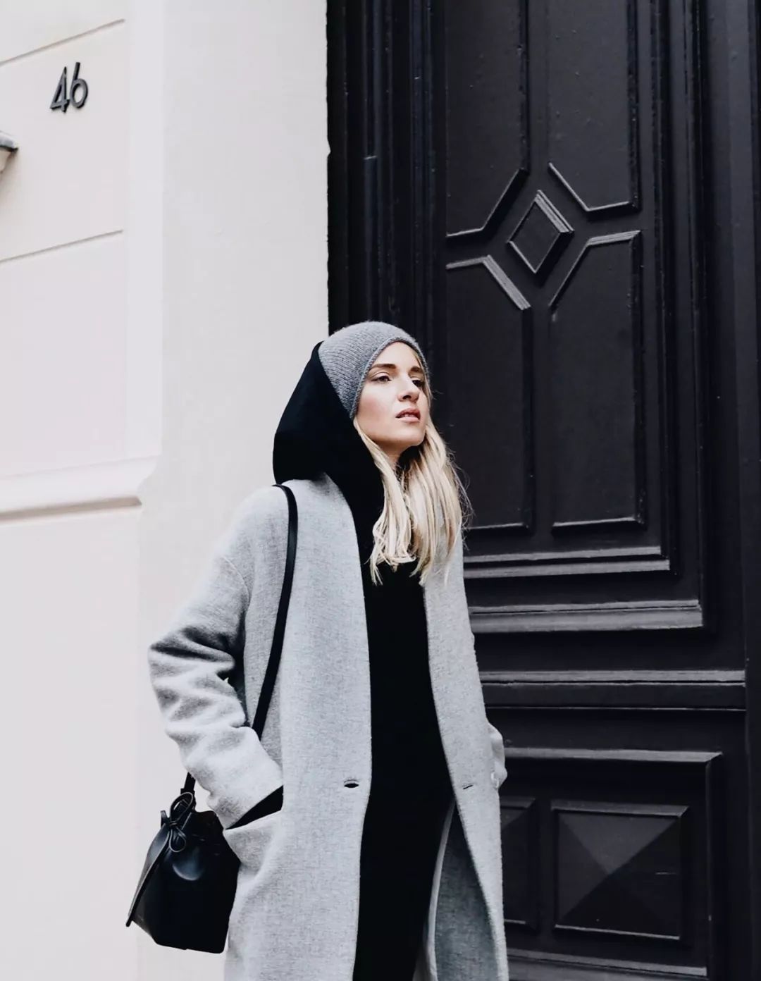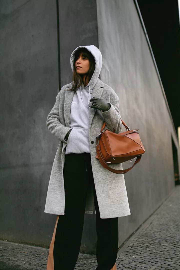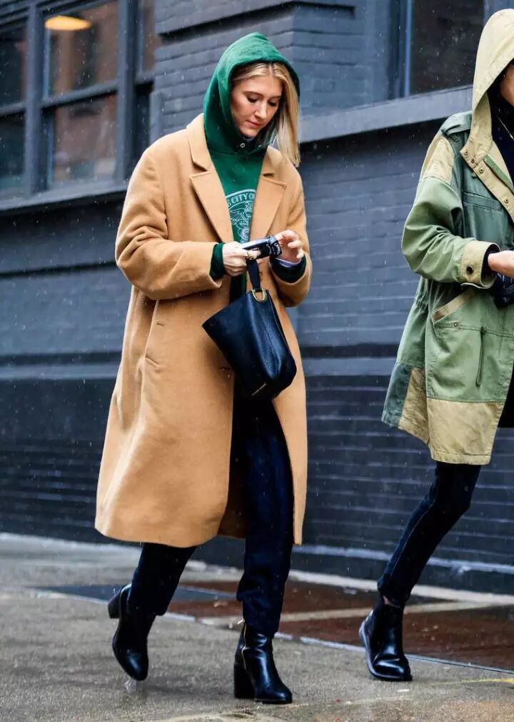 建議用連帽款式與大衣疊穿,會讓你的造型更具時髦層次感。