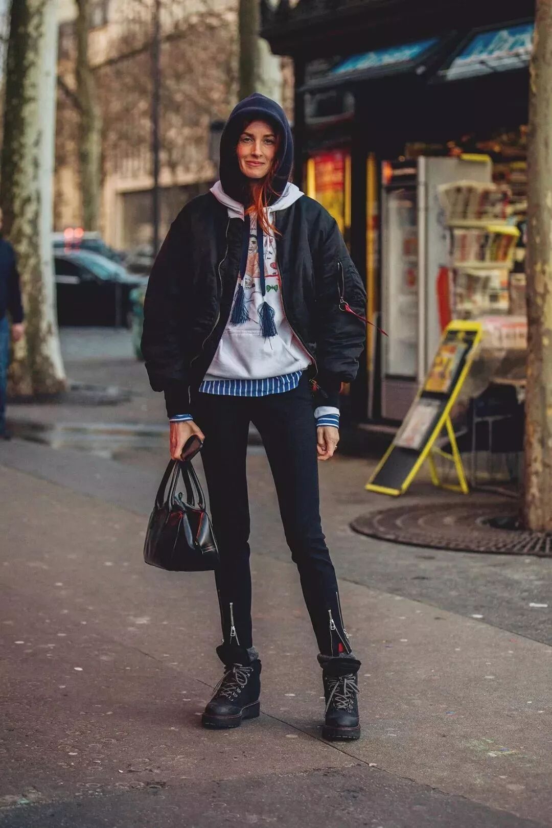 飛行員夾克+衛衣+小黑褲是潮人標配,上松下緊顯瘦無敵。