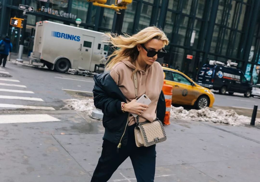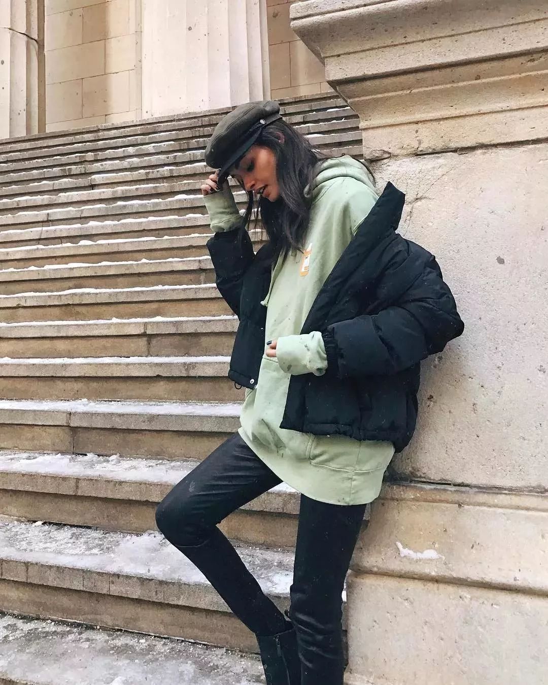 不管你的羽絨服是哪種顏色、款式,搭配黑色衛衣絕對是不出錯又時髦的選擇。