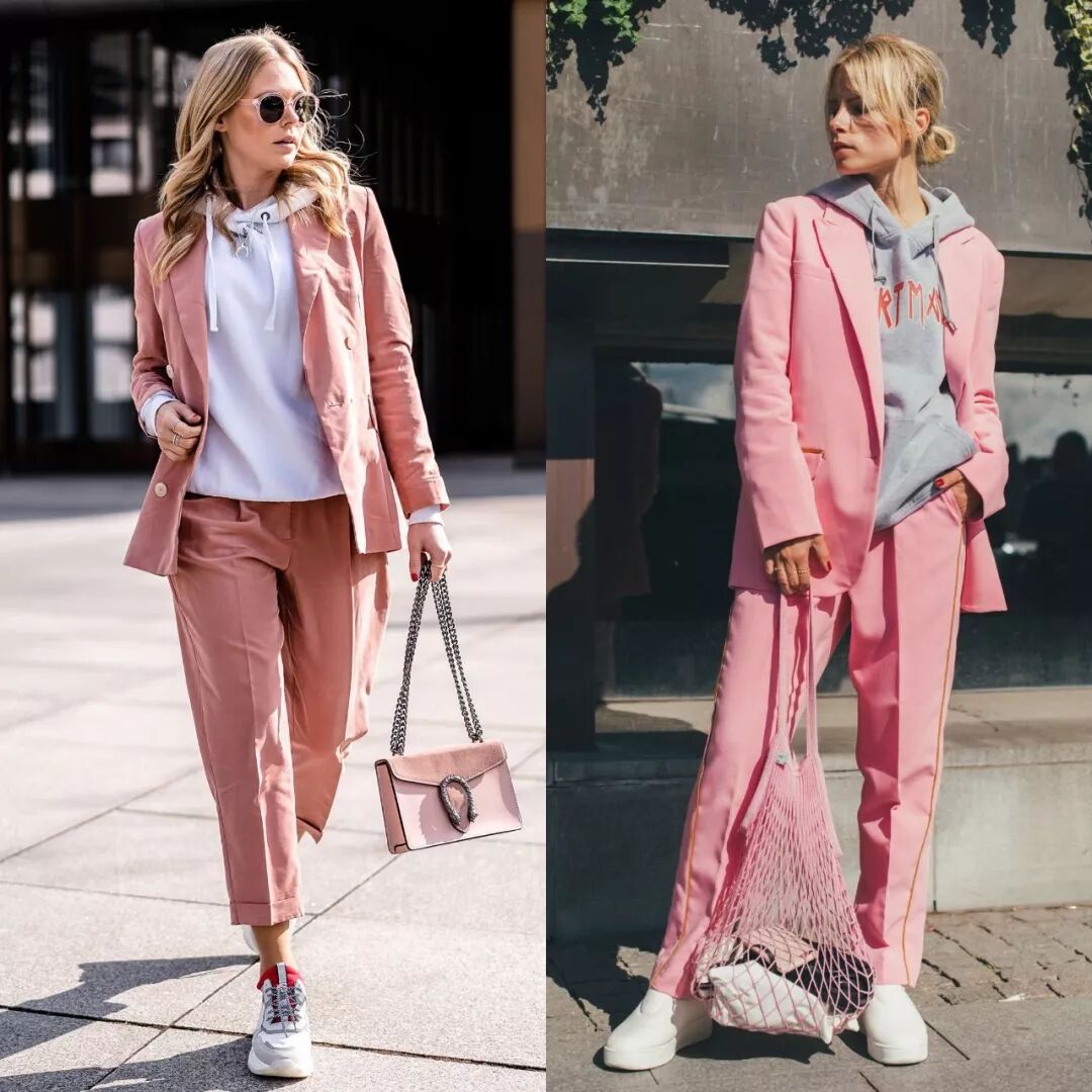 今季最火的要屬乾枯玫瑰粉色西服套裝,與衛衣玩混搭,又酷又美的娘man風撲面而來。