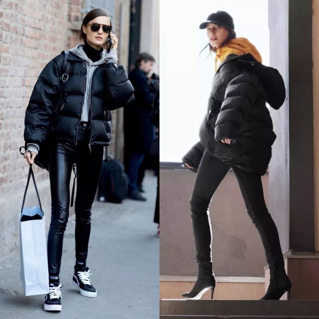 羽絨服常常與「顯臃腫」相掛鉤,因此搭配的時候要盡可能遵循「上松下緊」的顯瘦搭配法。像緊身小黑褲就會是羽絨服+衛衣的最佳拍檔。