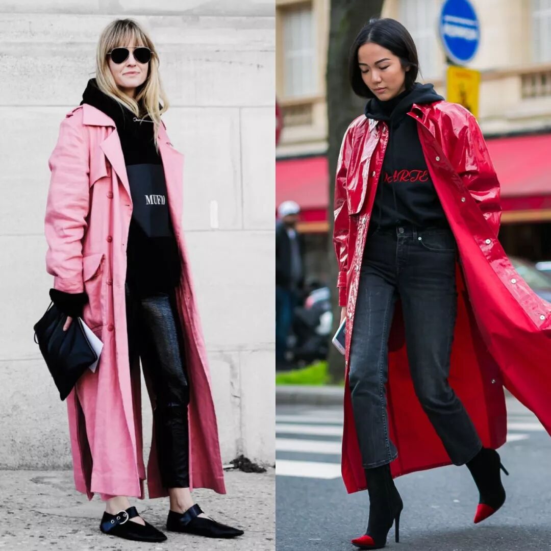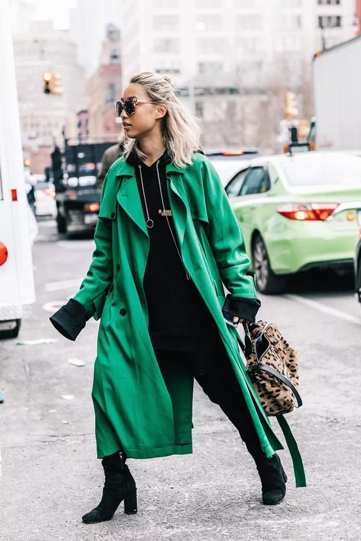 彩色大衣本身就足夠搶眼了,一般只需混搭基礎色衛衣就很chic。