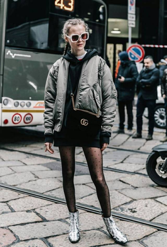 皮夾克+衛衣除了搭配中性褲裝外,混搭裙子更是大寫的驚艷,時髦又有女人味。記得要加上保暖連褲襪做打底噢,方能美貌溫暖兩不誤。