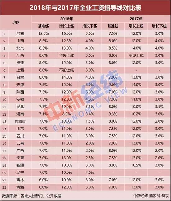 從各省的2018年企業薪水指導線情況來看,22個省份中,河南以12%居於首位,北京、山西兩地基準線以8.5%並列第二。除了吉林6.0%、青海6.0%,其餘20省份的基準線都在7.0%以上。