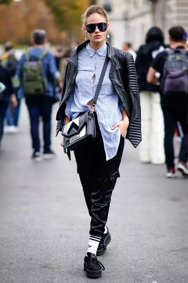 皮革吊帶褲可以說配上露肩設計的條紋襯衫,可以說是穿搭高段班,讓人眼睛一亮的搭配