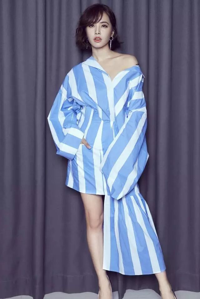 很多人覺得條紋穿搭就是無趣,穿的太多還會讓人頭昏眼花。在這里,Jolin蔡依林就聰明地利用半裙的開衩設計改變條紋走向,一掃條紋堆砌的呆滯無力。