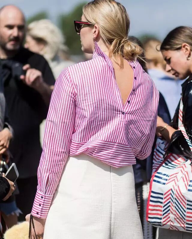 如果是穿裙裝,也可嘗試這種只紮一邊的搭配,穿出條紋襯衫的新意