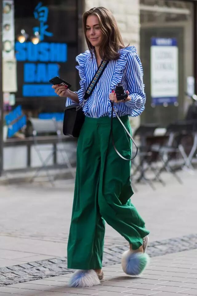 氣場相近的條紋襯衫與寬褲,不管怎麼搭都不太容易出錯。通常大家會選擇基本色系的寬褲(黑色、深藍、裸色),其實襯衫已是正經八百的單品,可以大膽點穿上鮮艷的寬褲,更可以展現兩者間衝突的可愛。