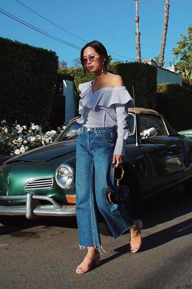 萬年不敗的兩個衣櫃單品碰在一起,經典與經典的協調性就是這麼優雅。丹寧褲和條紋上衣選擇清爽的淺色系,迎接春夏就是這一套了。