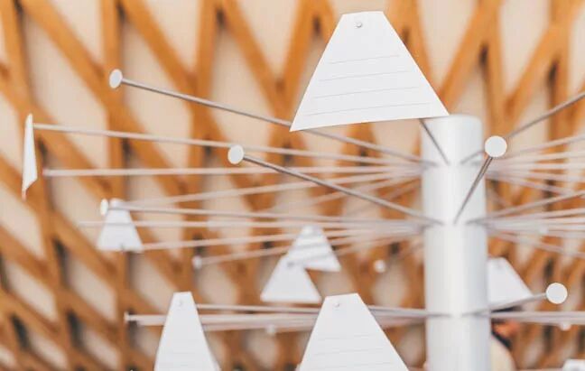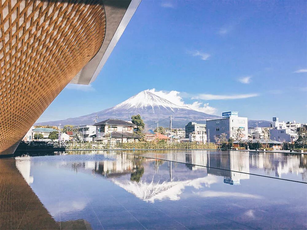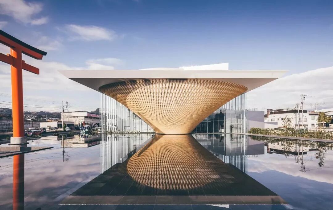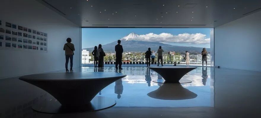 由 8000 塊長在山上的絲柏樹木材交叉拼合而成的倒圓錐形裝置,從外面看與入口水池形成小富士山「倒映」,繞到館內則與落地玻璃外牆和連廊融為一體。最頂層觀景大廳擺放了兩把「倒富士椅子」,供人們靜坐欣賞窗外秀美的山水。即使是書寫寄語的卡片,也被剪成可愛的形狀懸掛在架子上。