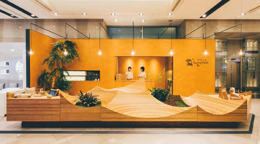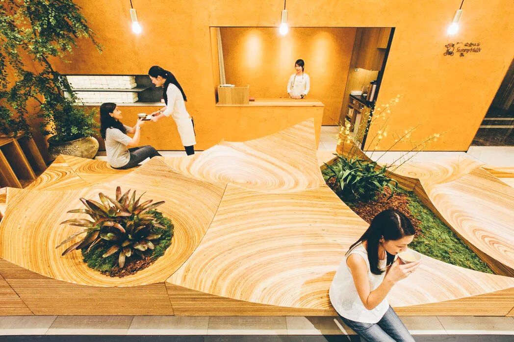 連綿起伏如山丘的裝置其實是顧客的坐席,溫暖的木色、年輪的刻紋和點綴的綠植,坐下仿佛被靜謐的森林包裹,再配上美味鳳梨酥,是雙重幸福的享受。