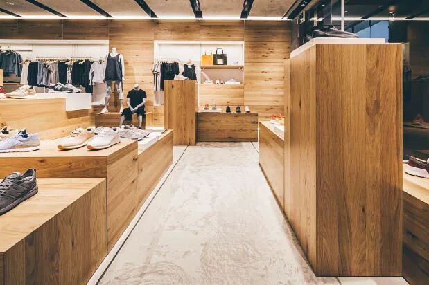 兩邊大地色的木格牆面其實都是一個個隱藏的盒子,拉開可以用作商品展示,推回去也能儲存貨物,就連收銀機也是裝在其中一個格子里,小心思非常有趣。店面整體還搭配水泥風地面,還原生活最真實輕鬆的一面,很討年輕人喜歡。