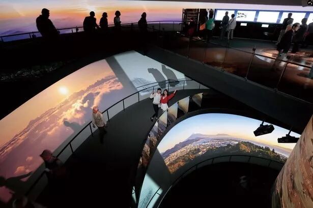 為了讓遊客更沉浸式全方位感受富士山,館內還特意搭建了一條全長 193 米的旋轉斜坡。沿著斜坡緩緩爬升,旁邊牆壁會逐漸轉變從蔥蘢山腳到雪封山頂的景色,以及不時閃現幾個同行登山者的身影,令遊客產生自己果真在攀登富士山的錯覺。