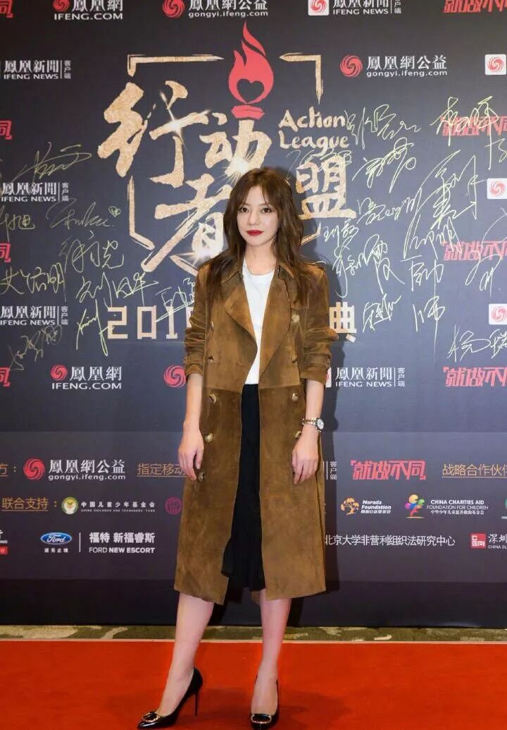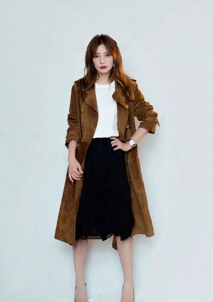 可以學學趙薇這一身的穿搭,一件棕色的風衣看起來非常的大氣了,披下來的小捲髮看著特別的可愛,內搭了白色的衣服還有黑色的裙子