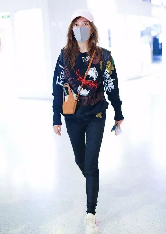 杏色的毛衣看起來非常的有個性了,下搭了一條黑色的皮褲看著比較的帥氣,粉紅色的鞋子看起來少女心滿滿了,很有亮點