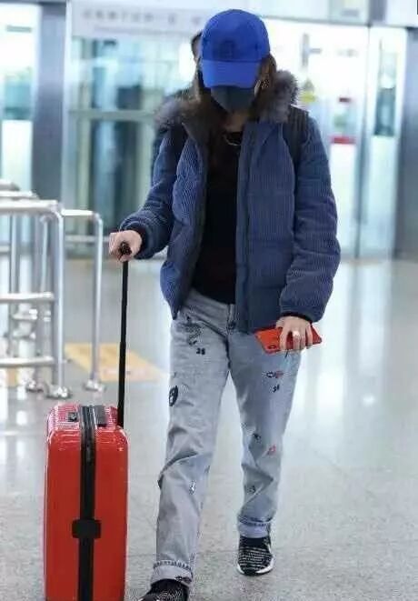 藍色羽絨服使得整個人看起來非常的活潑了,內搭了一件黑色的衣服還有一條淺藍色的牛仔褲,看著特別休閒的樣子