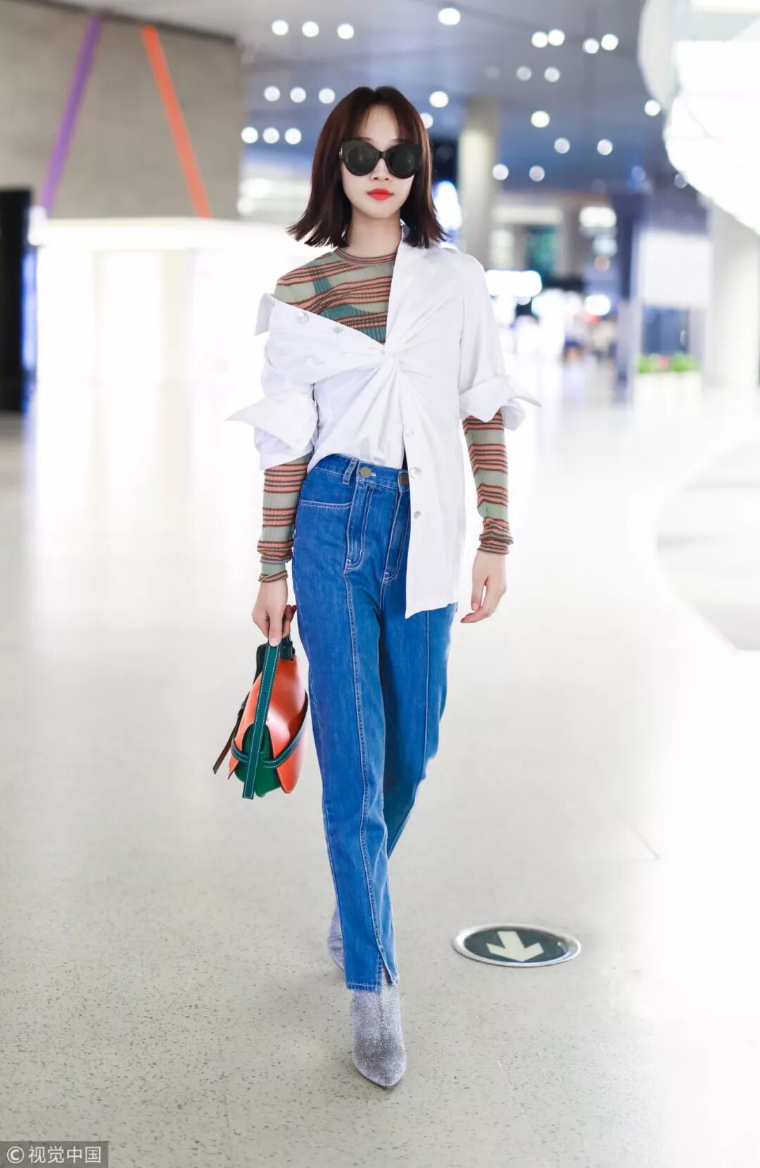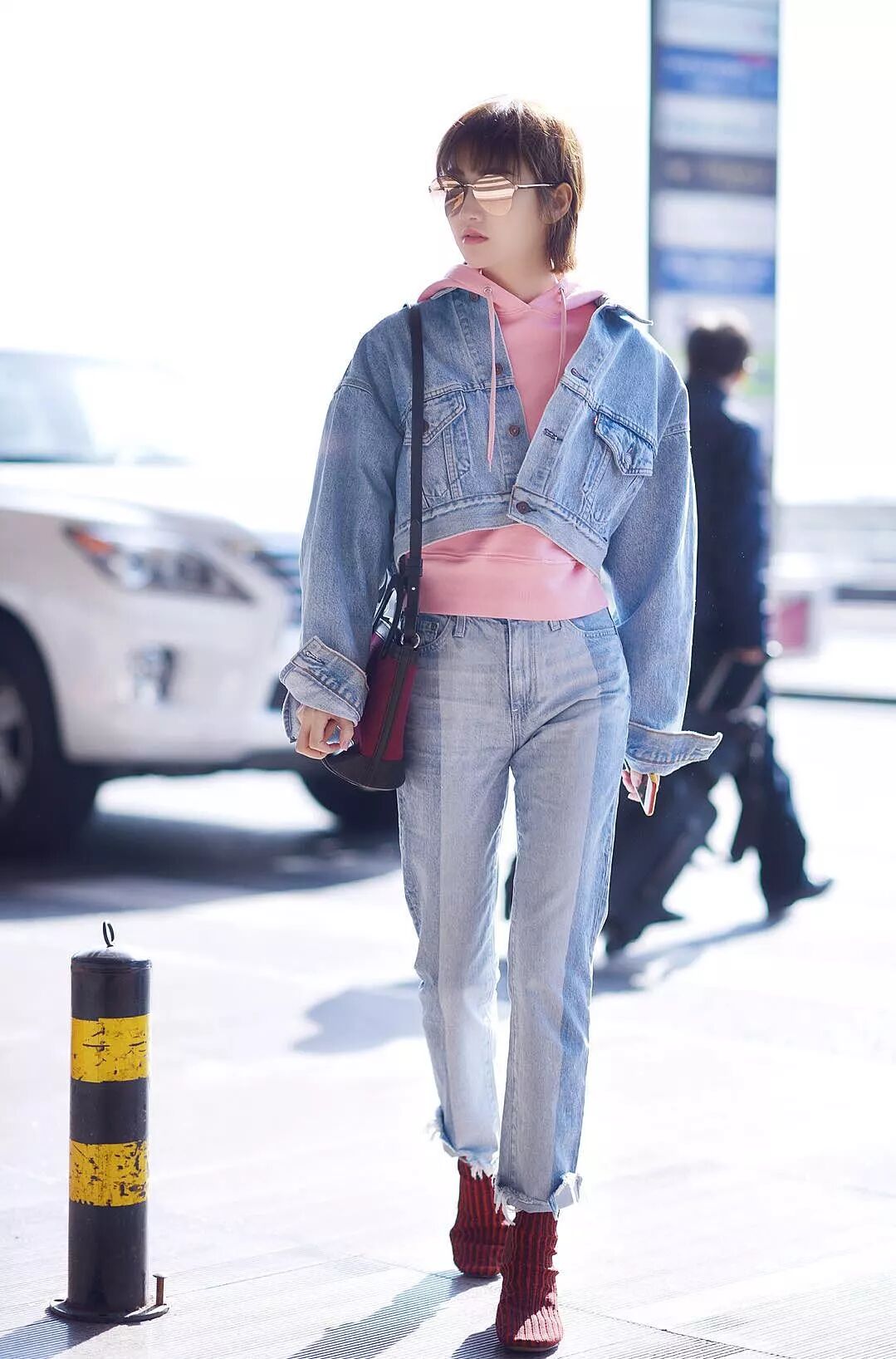 景甜機場街拍時也曾腳踩Celine紅色條紋粗跟襪靴,搭配Re/Done藍色短款牛仔夾克,展露帥氣丹寧風之餘,一抹亮色也為著裝添彩不少。