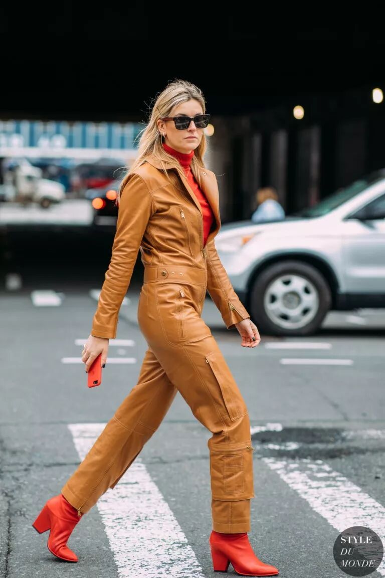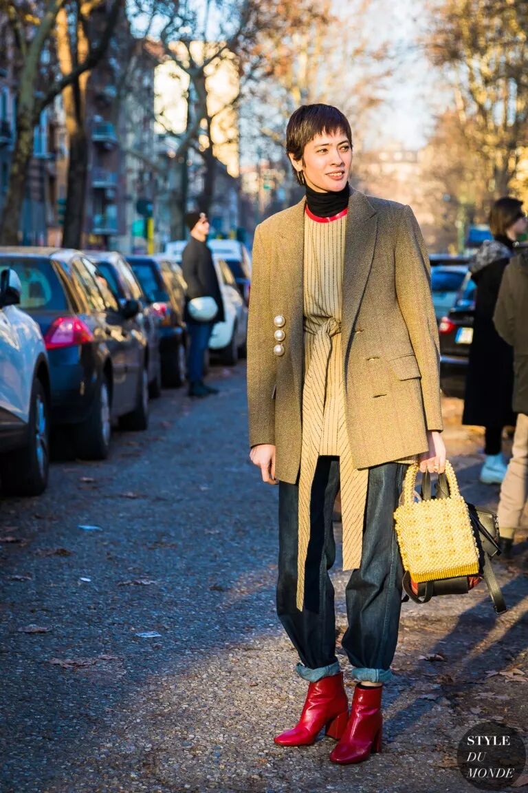 街頭潮人們在穿彩色靴時,選擇最多的還是色彩呼應的法則,搭配褲裝鄰近色的處理失誤率最低,也能讓視覺和諧度達到更加柔和的狀態。