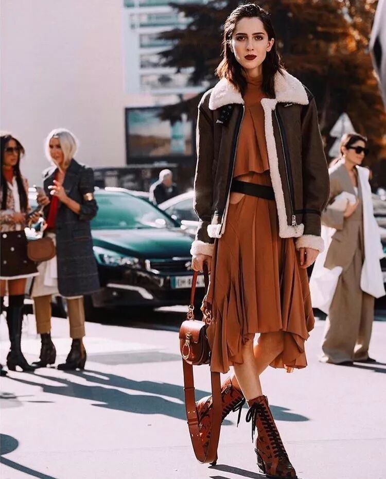 見多了夾克與褲裝的搭配,偶爾來點裙裝的混搭反而不失違和感,率性與柔美的結合被潮色靴點綴地淋漓盡致,實在是可鹽又可甜。