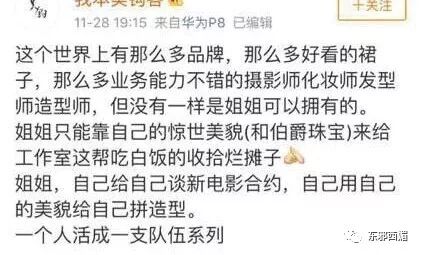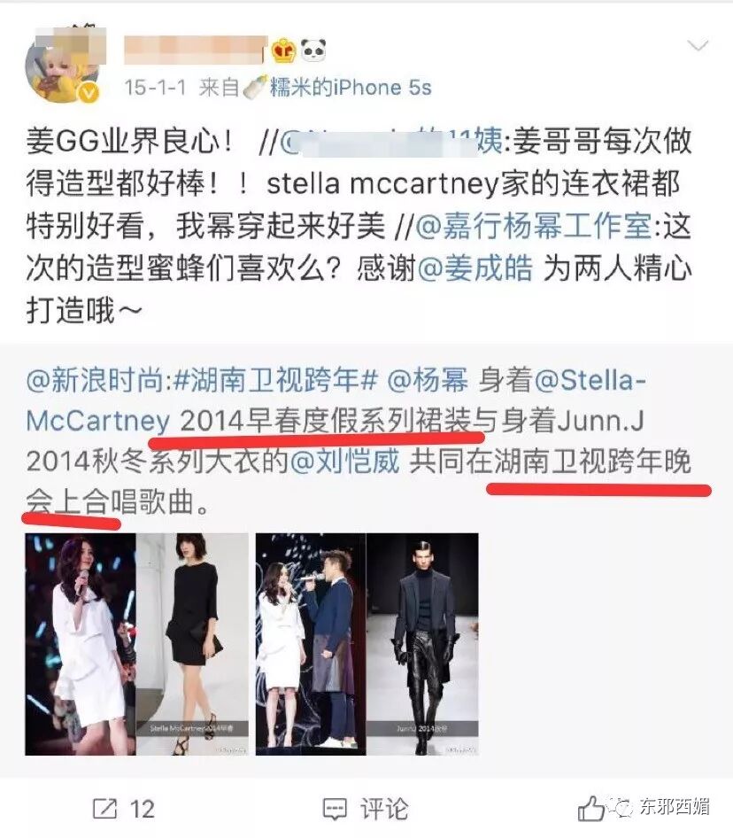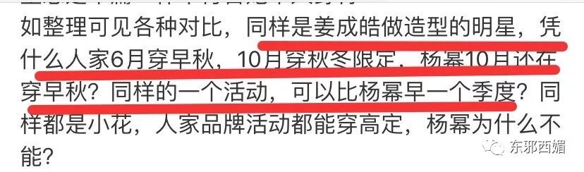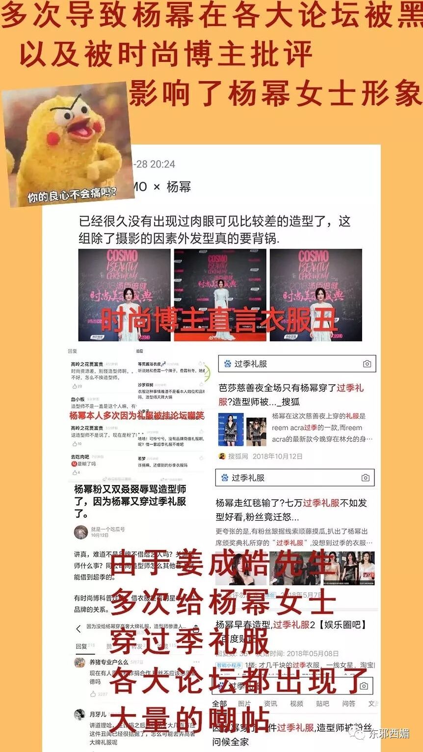 粉絲們把這種現象,都歸結於造型師不上心不給力。但在她們自己的聲討文章中,卻寫了同是這個造型師負責的其他明星,卻能穿比楊冪更新季度的衣服。