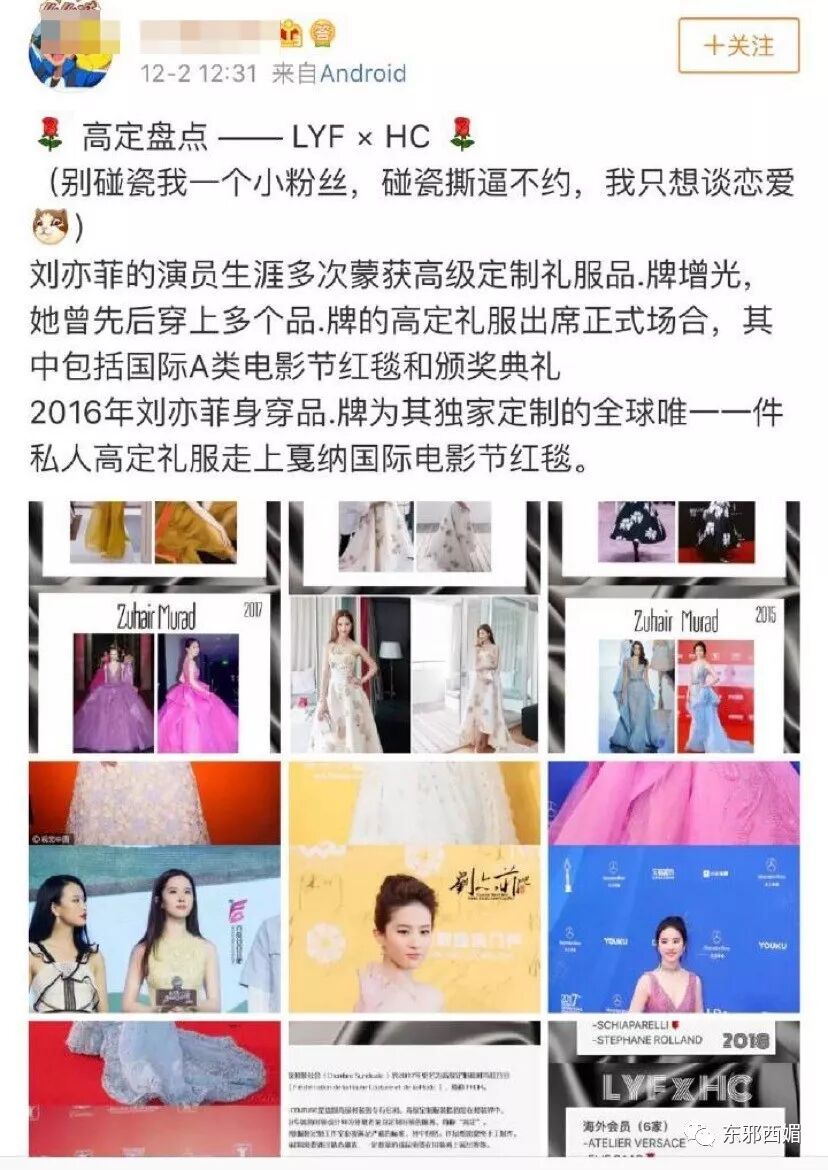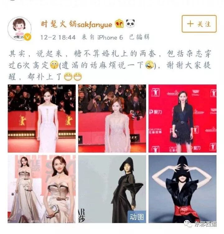 楊冪同場穿的是We Coutour2016秋冬高定。粉絲一看,高定耶,興沖沖到處去吹,結果卻被人科普是「偽高定」。