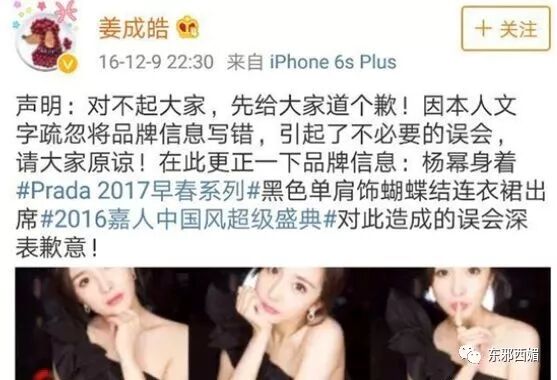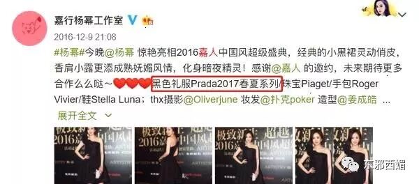 16年底造型師把楊冪穿的PRADA2017早春,寫成了春夏,讓粉絲生氣地記到了小本本上。這工作態度是有點疏忽大意了,不過從這可以看出,當時大冪冪已經能借到大牌最新一季的禮服。