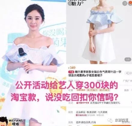 風波的起因,是楊冪在某次活動上穿的這件裙子。她家粉絲在網上貼出對比大圖聲討:造型師給藝人穿300塊的淘寶款!豈有此理肯定吃了回扣!