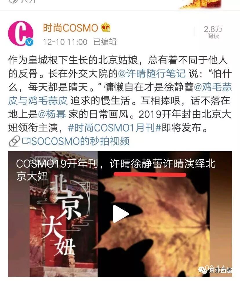 今天終於傳來了COSMO開年封的消息,卻是和許晴、徐靜蕾一起的三人封。從雜誌官微的文案刊,楊冪排名在最後,視頻標題甚至一度把楊冪錯打成了許晴。