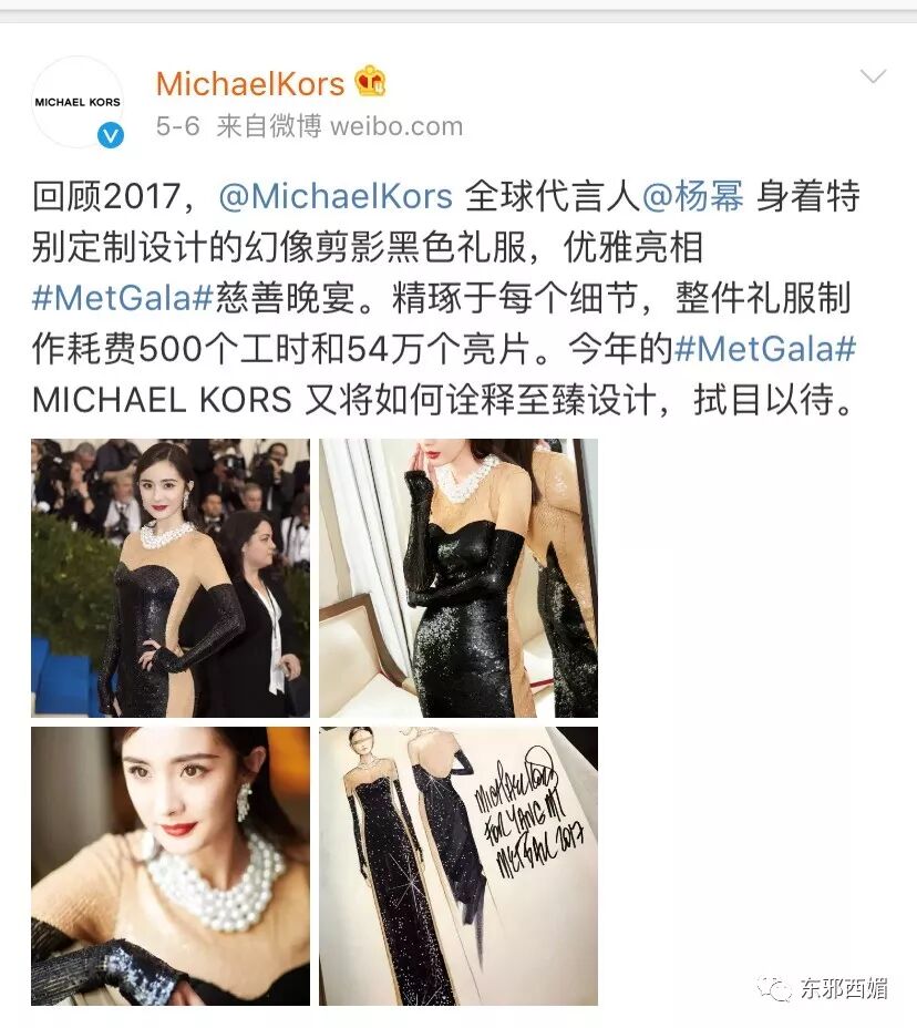 去年楊冪還只是品牌摯友的時候,MK就邀她去met gala 。今年5月又到同一盛典時,楊冪已經榮升為全球代言人,MK卻只尷尬地發了一條「回顧2017楊冪優雅亮相……」,就不再提今年的安排了。