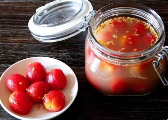 5、將剝好皮的小西紅柿放入一個可以密封的瓶子或者玻璃盒子中,倒入之前榨好的梨汁,撒一大勺幹桂花